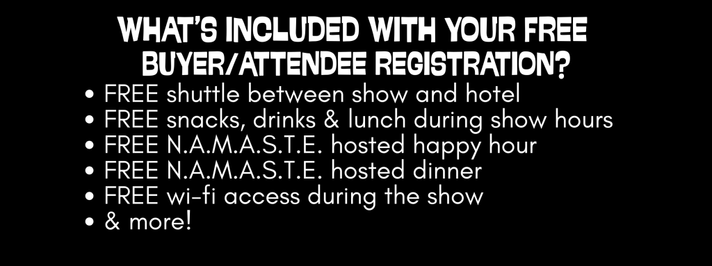 N.A.M.A.S.T.E. is a wholesale show open only to trade customers and not open to the public. By registering to attend you agree that you are affiliated with a retail business (i.e., ownership, employment) reselling merchandise and will provide documentation if requested for admittance to the show.